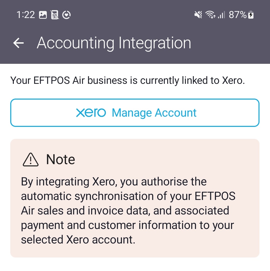 This is where you can connect your EFTPOS Air account to Xero accounting. This allows you to synchronise all your EFTPOS Air invoices and sales through to your Xero account.