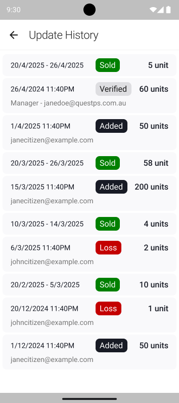 Stock updates can be tracked through the Update History menu. This menu includes all stock changes, including additions, losses and sales.