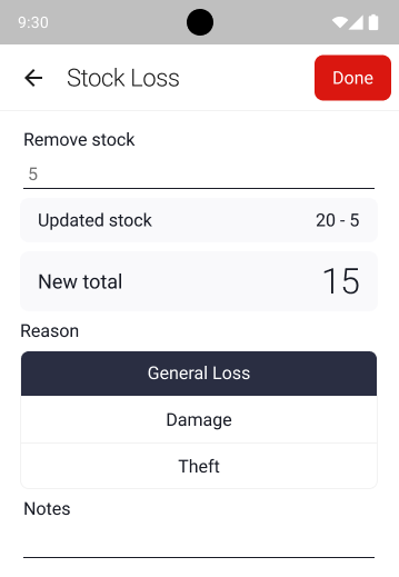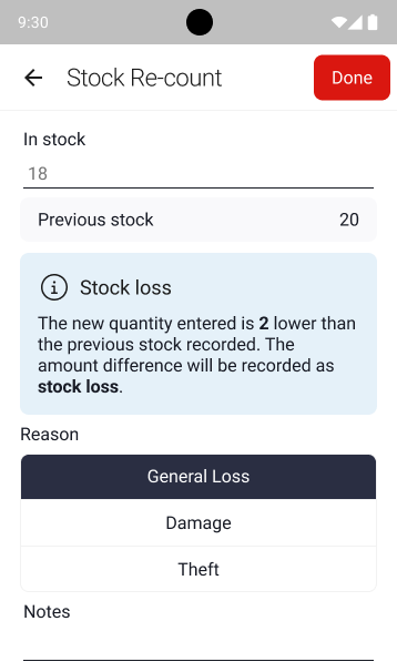 The Stock Loss menu prompts you to enter a count of stock that has been lost (not sales). Updating this will indicate the updated stock count but also allows you to enter a reason for the loss.