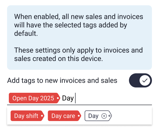 Auto Tagging enables tags to be added to all invoices and sales automatically on the individual device and does not impact invoices and sales from other devices under the business.