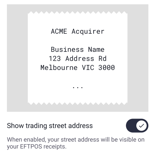 This feature allows you to show or hide your business's street address on EFTPOS receipts. You can modify or hide the address displayed on invoices by editing your business details in the EFTPOS Air app.