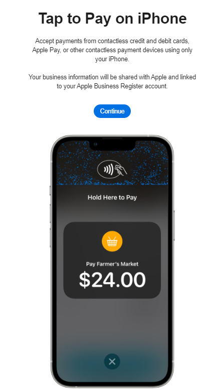 | Step 3: This will open the onboarding for Tap to Pay on iPhone. Select Continue. | ![]() |