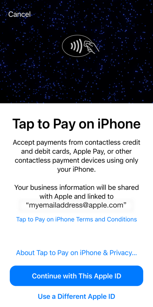 The first time you enable Tap to Pay on iPhone, you'll be prompted to accept the Tap to Pay on iPhone Terms & Conditions. This will also link Tap to Pay on iPhone to your Apple Account. For more information, see the Linking Your Apple Account section below.